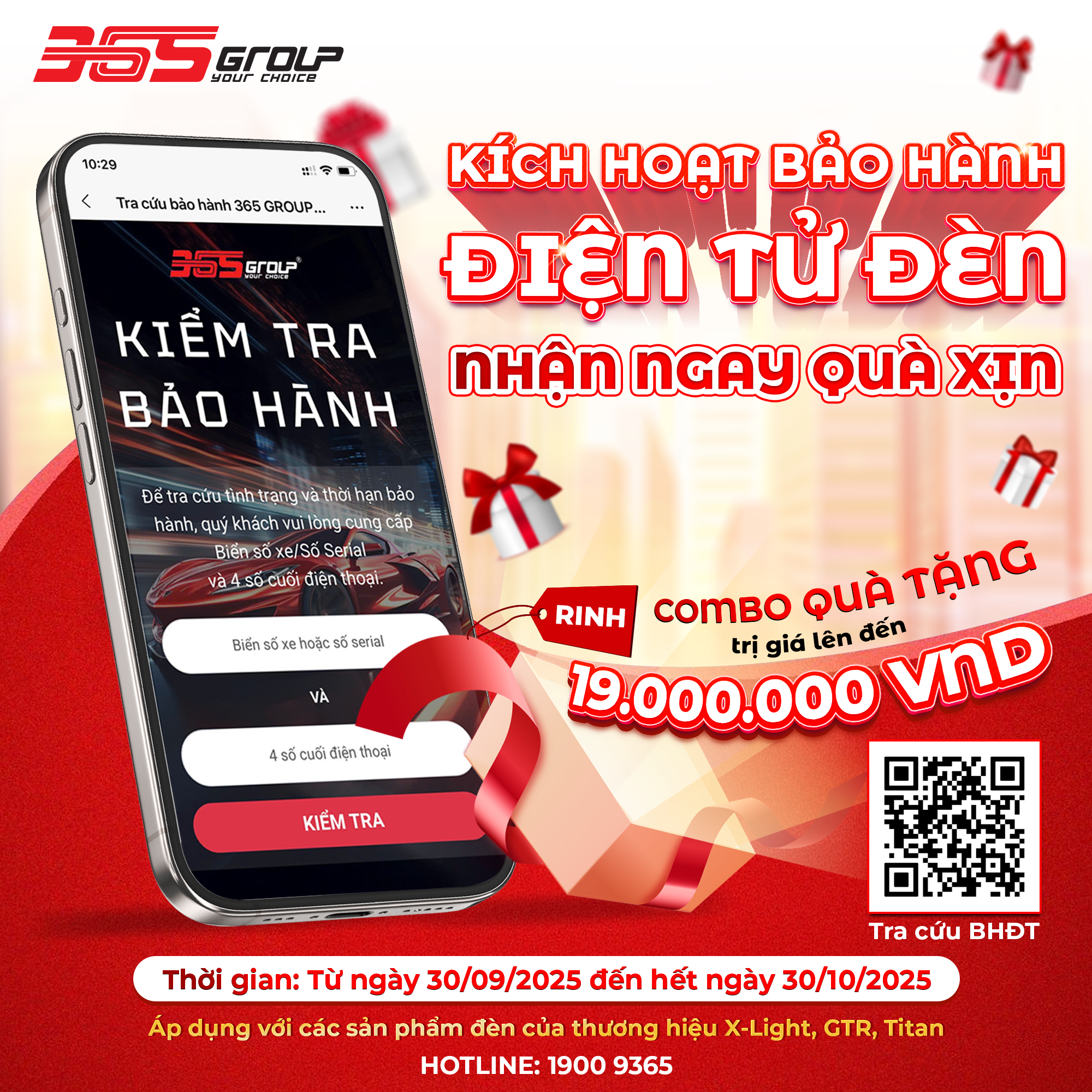 365 Group xin trân trọng thông báo đến toàn thể các đại lý thuộc hệ thống Auto365, GTR Việt Nam và X-Light Việt Nam về việc triển khai chương trình “Kích hoạt bảo hành điện tử đèn - Nhận ngay quà xịn” nhằm tri ân sự đồng hành, hợp tác và đóng góp của quý đại lý trong thời gian qua.